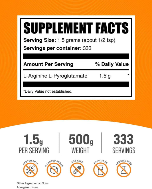 BulkSupplements.com L-Arginine L-Pyroglutamate Powder - Gluten Free Nitric Oxide Boost - 1500mg per Serving, 500g (1.1 lbs) - Arginine Supplement Powder