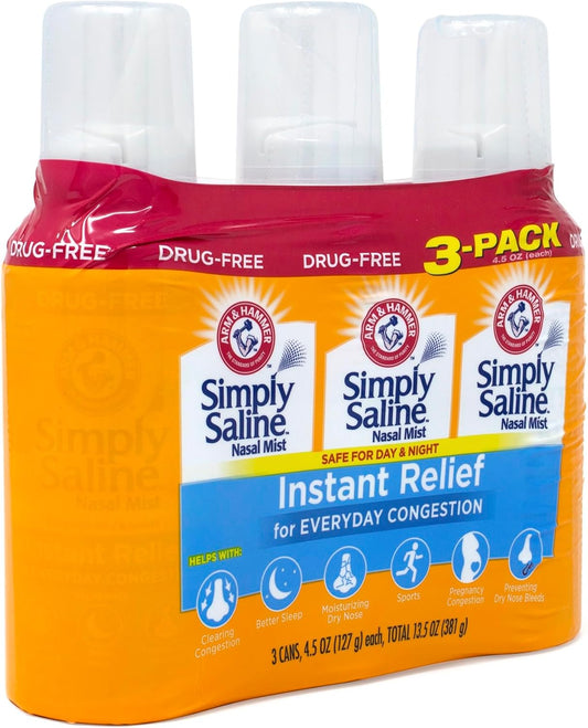Arm & Hammer Simply Saline Nasal Relief Mist Spray - 4.5oz - Giant Size - Pack of 3 - Clears Congestion & Soothes Irritation