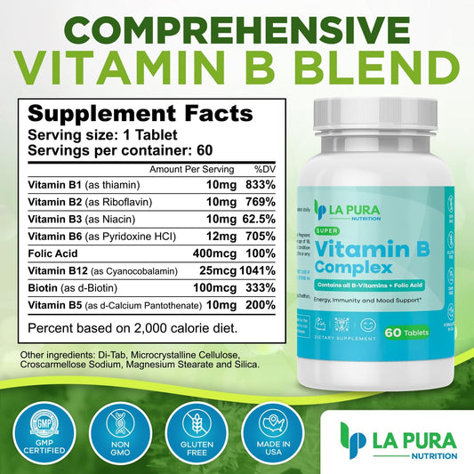 LaPura Super Vitamin B Complex with Folic Acid & Biotin - 60 Capsules - Energy, Immune & Mood Support - Non-GMO USA Made