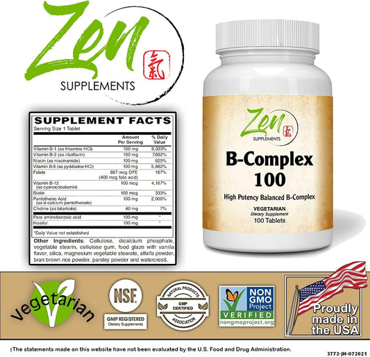Zen Supplements Full-Spectrum B Complex Vitamin Supplement with Folic Acid, Biotin, and Inositol - 100 Tablets for Immune, Cardio, and Energy Support