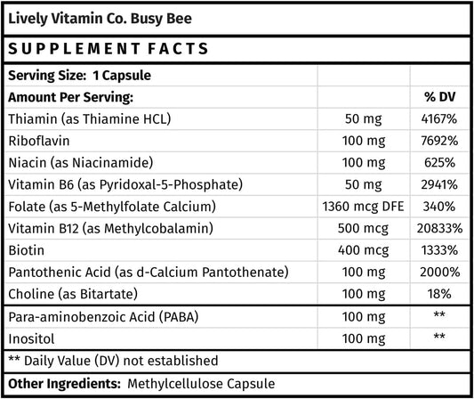 LIVELY VITAMIN CO. Busy Bee - High Bioavailability B Complex with Choline - Energy, Stress, Brain Fog, Mental Clarity - Antioxidant Support - 90 Vegan Capsules