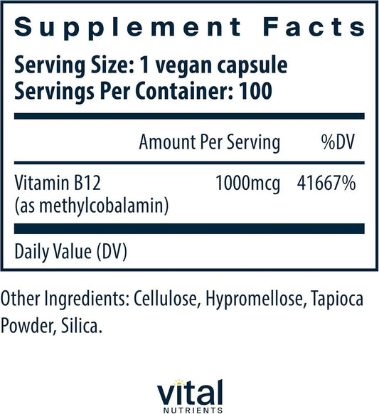 Vital Nutrients Vitamin B12 1000mcg - Vegan - Methylcobalamin for Metabolism, Cognitive & Nervous System Health* - High-Potency B12 Supplement - Gluten, Dairy, Soy Free - 100 Capsules