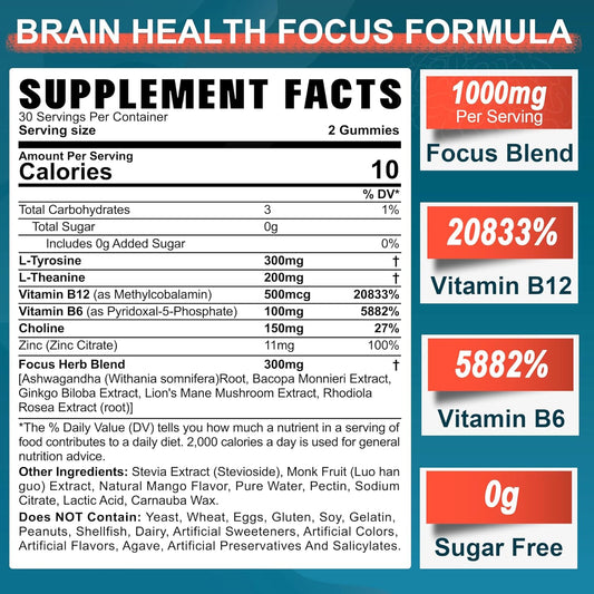 Sugar Free L-Tyrosine Gummies with L-Theanine, Vitamin B6 & B12 for Brain Health - Lion's Mane, Ginkgo Biloba, Bacopa Monnieri, Rhodiola Rosea, Choline - 2 Packs