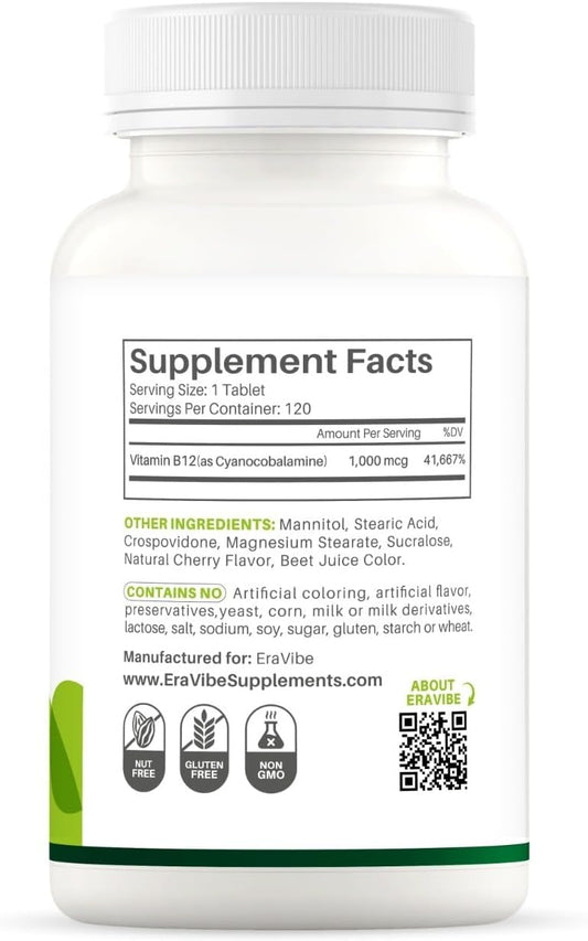Natural Cherry Flavored Fast Dissolve Vitamin B-12 1000 mcg Tablets - 120 Count, Gluten-Free & Non-GMO