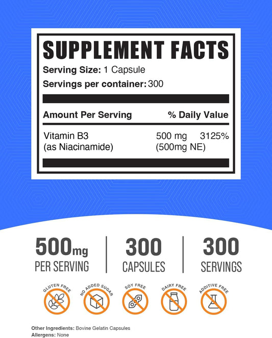 Niacinamide 500mg Capsules - Vitamin B3 Supplement, Gluten Free, 300 Capsules - Bulk Size for Daily Use - Buy Now