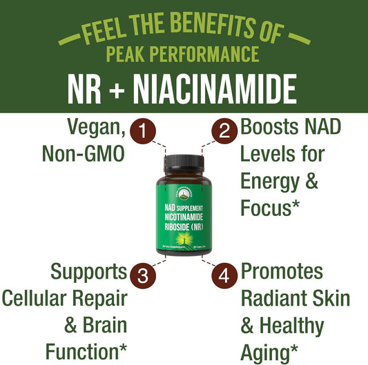 Premium Nicotinamide Riboside NR Supplement for Peak Performance. NAD+ Booster with Niacinamide. Non-GMO, Vegan, Gluten-Free. Third Party Tested. Ideal for Women and Men.