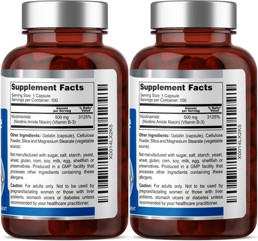 Nicotinamide B-3 500mg Capsules 2 Pack - Niacin Flush-Free Vitamin Formula for Skin Health - Natural Nicotinic Amide Supplement