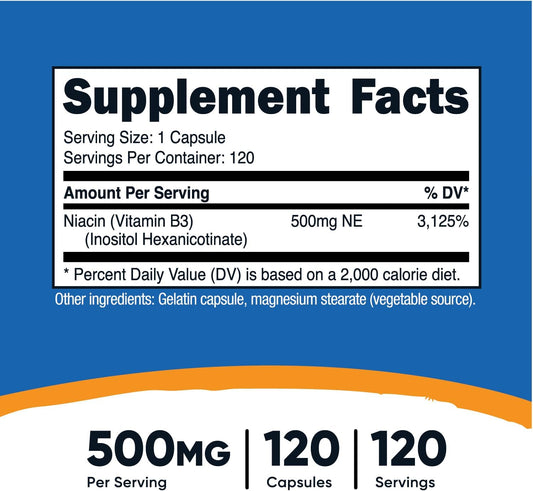 Flush-Free Niacin Inositol Hexanicotinate 500mg, 120 Capsules - Nutricost Vitamin B3 Supplement