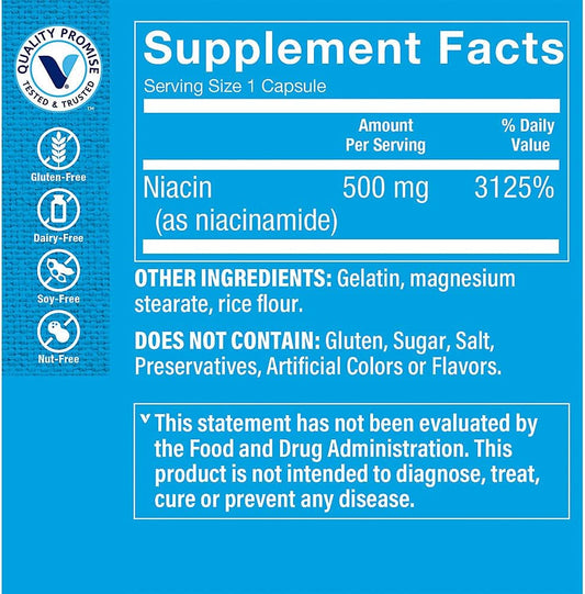 Vitamin Shoppe No Flush Niacin 500MG Capsules - Supports Normal Cholesterol Levels, Metabolism, Energy Production - 100 Count