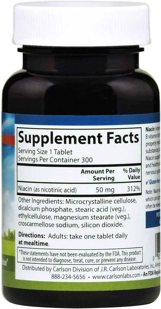 Carlson Niacin 50mg Tablets for Cholesterol, Energy, Heart, Nerve Function - 300 Count