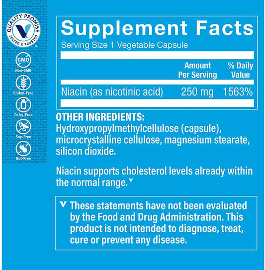 Vitamin Shoppe Niacin 250MG Capsules for Healthy Cholesterol Levels - Once Daily Supplement (100 Capsules)