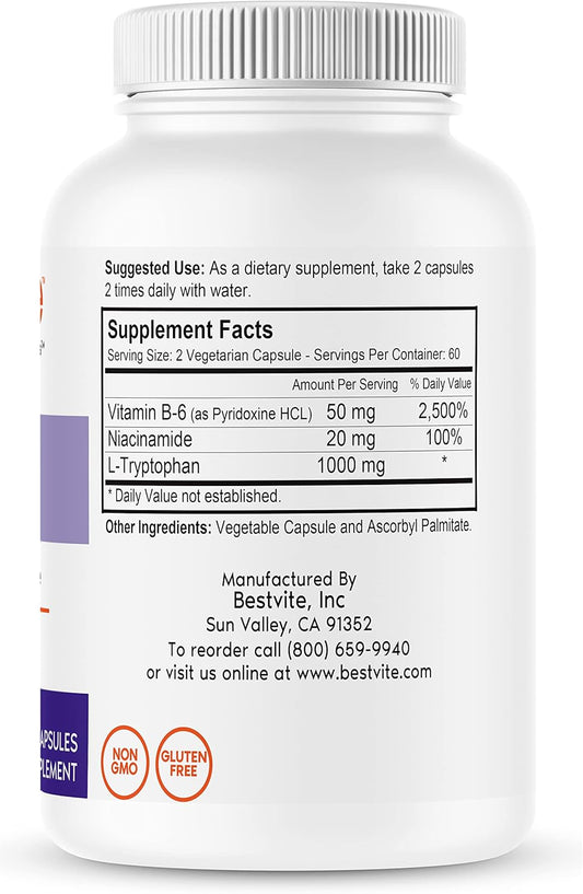 Premium L-Tryptophan 500mg Supplement with Vitamin B3 & B6 - 120 Veg Capsules, Non-GMO, No Fillers, No Stearates