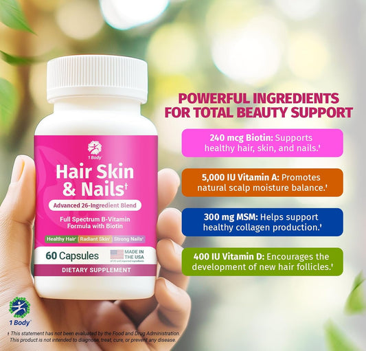 Hair Skin Nails Biotin Vitamins - 26 Vitamins, Minerals, Herb Extracts - Hair Nail Growth, Skin Glow Supplement - Men Women - 60 Vegan Capsules