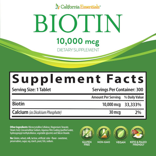 High Potency Biotin 10000mcg Tablets for Skin, Hair & Nail Growth - California Essentials | Non-GMO, Vegan, Gluten & Dairy Free - 300 Tablets