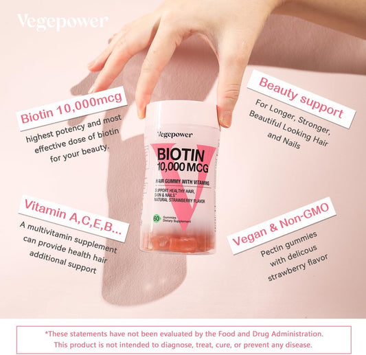 Vegan Biotin Gummies 10000mcg with Vitamin C, A, D, B-Complex, Folate, Zinc - Hair Growth Supplement for Women & Girls - Non-GMO Strawberry Flavored - 120 Count