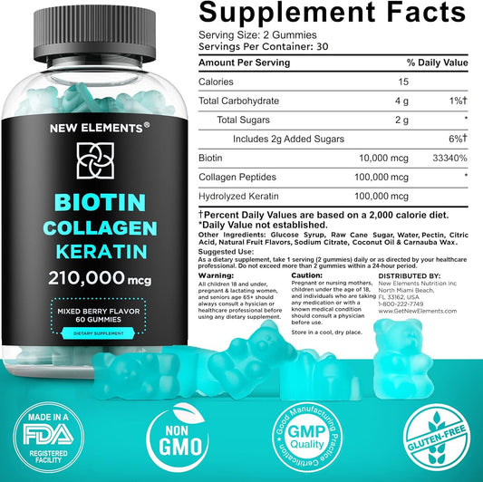 Natural Biotin Gummies with Keratin, Collagen Peptides, Sea Moss, Black Seed Oil, Bladderwrack, Burdock Root | Gluten-Free & Non-GMO