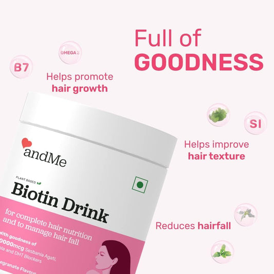 Plant-Based Biotin Powder with Herbal Extracts for Hair Growth, Vegan Formula with Omega-3 and Amino Acids, DHT Blocker - Pomegranate Flavour (150g)