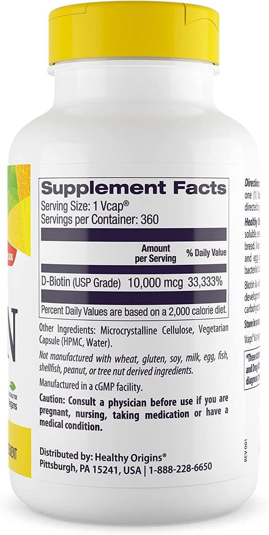 High-Strength Biotin (B7) 10,000 mcg for Skin, Hair & Nails - Non-GMO, Gluten-Free, Vegan - 360 Veg Capsules by Healthy Origins