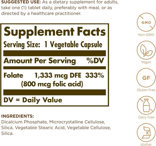 Solgar Folate 1,333 mcg DFE 250 Tablets x 2 - Heart & Prenatal Health - Non-GMO, Vegan, Gluten & Dairy Free, Kosher - 500 Servings
