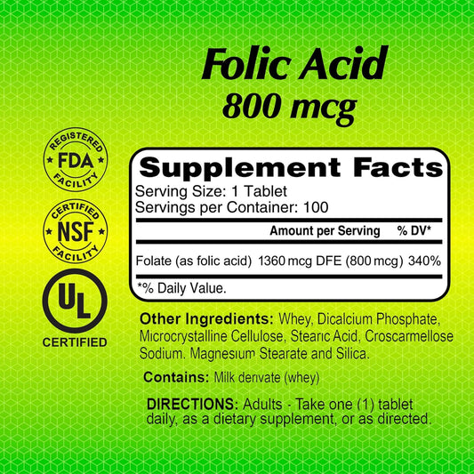 Folic Acid 800 Mcg Supplement for Cardiovascular Health, Metabolism, Brain, & Pregnancy Development - 100 Tablets by ALFA VITAMINS