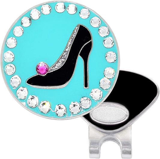 Black Stiletto on Teal Golf Ball Marker with Austrian Crystals - Magnetic Hat Clip | Girly Golf Accessory for Women Golfers