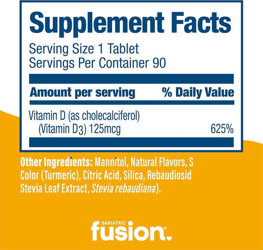 Bariatric Fusion Dissolvable Vitamin D3 5000 IU Lemon Citrus Quick Melt Tablets - Bone Support Supplement - Gluten, Dairy, Soy Free - 90 Fast Melting Tabs