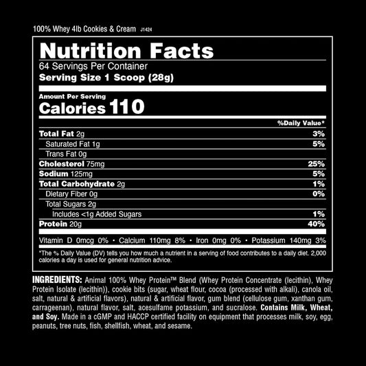 Cookies & Cream Animal 100% Whey Protein Powder - 4 lb Whey Blend for Pre or Post Workout Recovery with BCAA Branched Chain Amino Acids - Low Sugar Meal Replacement Boost