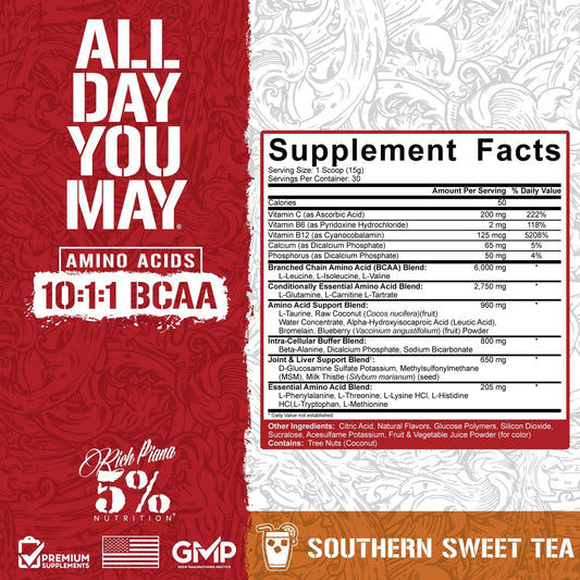 Premium AllDayYouMay BCAA Powder for Muscle Recovery & Endurance | Rich Piana 5% Nutrition Intra & Post Workout Amino Acids - Southern Sweet Tea Flavor | 16.3 oz, 30 Servings