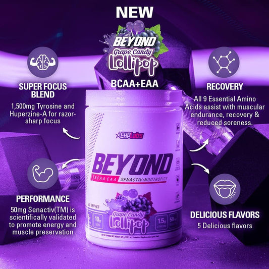 EHP Labs Beyond BCAA Grape Candy Lollipop Powder - Essential Amino Acids Supplement for Post Workout Recovery, 10g BCAAs & EAAs, 60 Servings