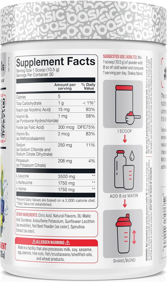Vegan BCAA Powder with 7g BCAAs, Electrolytes, Sugar-Free, Supports Muscle Recovery - Blueberry Lemonade Flavor, 30 Servings