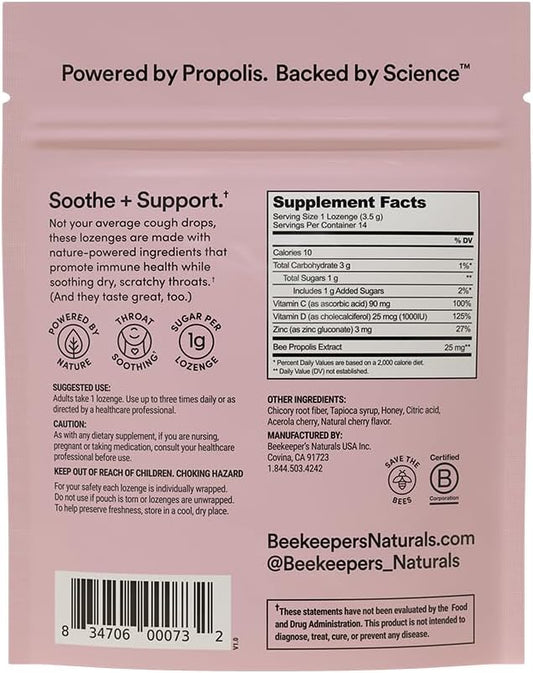 Beekeeper's Naturals Soothing Cherry Cough Drops - Immune Support with Vitamin C, D, and Propolis - Throat Lozenges, 14 Count