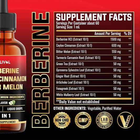 Berberine Liquid Drops with Ceylon Cinnamon Extract and Bitter Melon - 10in1 Formula with 7 Herbs - 2 Fl Oz