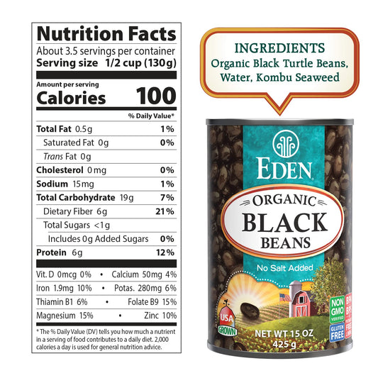 Organic Black Beans 15 oz Can (12-Pack) - No Salt, Non-GMO, U.S Grown, Heat & Serve - Macrobiotic Turtle Beans, Frijol Negro, Caviar Criollo
