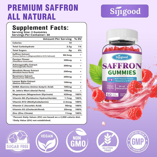 Premium Saffron Gummies 2 Pack - Relaxation & Focus Supplement with Passion Flower, Magnesium & Vitamins - Raspberry Flavor, 120 Count for Men, Women, Kids