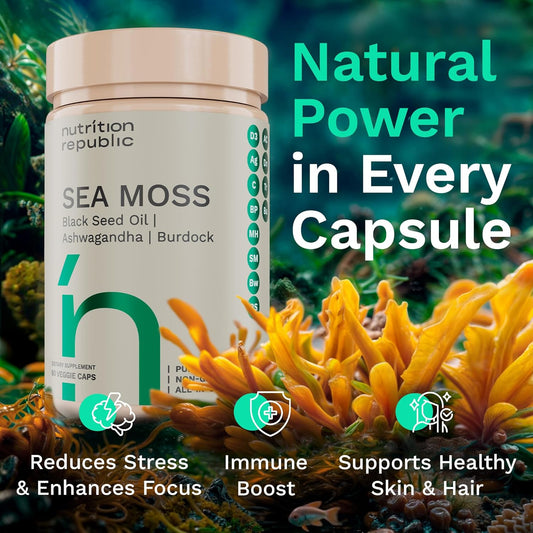 Sea Moss Supplement Capsules with Black Seed Oil, Ashwagandha, Burdock Root, Vitamin C - 60 Veggie Capsules for Multimineral Support