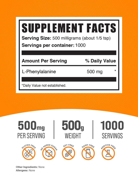 L-Phenylalanine Powder 500mg - Amino Acid Supplement, Gluten-Free, 500g (1.1 lbs) - BulkSupplements.com