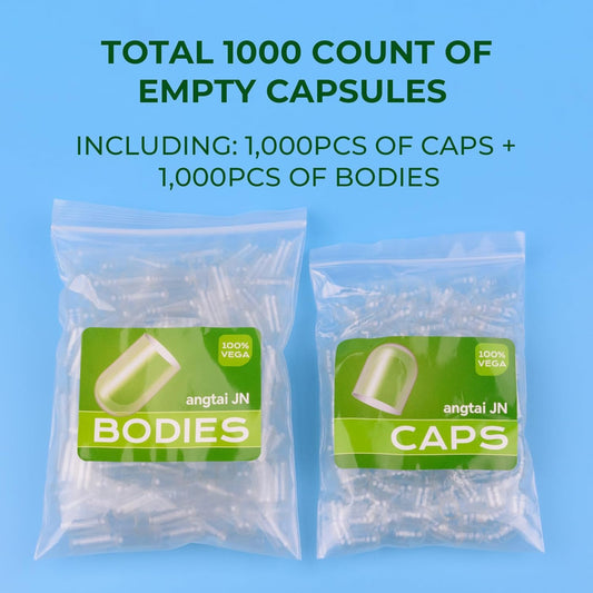 Angtai JN Vegan Size 0 Empty Pill Capsules Kit - 1,000 Caps + 1,000 Bodies - Plant Based, Gluten Free, Non-GMO, Halal Certified - DIY Your Own Vegetarian Supplements