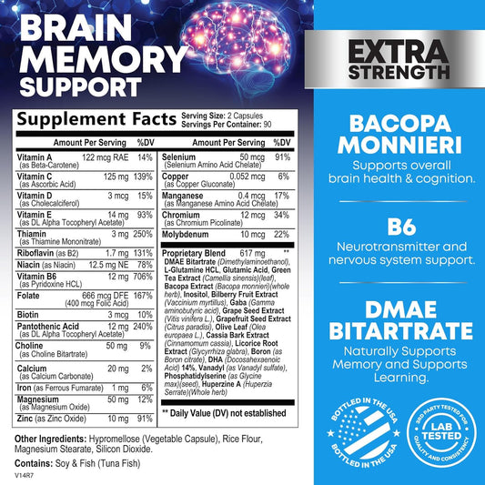 Premium Brain Health Supplement - 180 Capsules with 40 Nootropics & Vitamins for Memory, Focus, Mental Clarity, Alertness, and Concentration - Cognitive Support Pills with B6, B12, Phosphatidylserine