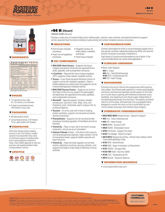 Systemic Formulas #44 - H Heart Support Supplement - Advanced Formula for Cardiovascular Health and Function - 60 Capsules