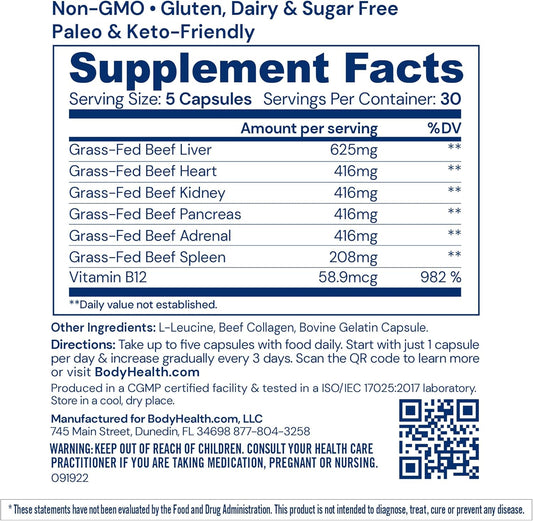 Grass-Fed Glandular Organ Complex Supplement - Beef Liver, Heart, Kidney, Pancreas, Spleen, Adrenal - Non GMO (150 Capsules)