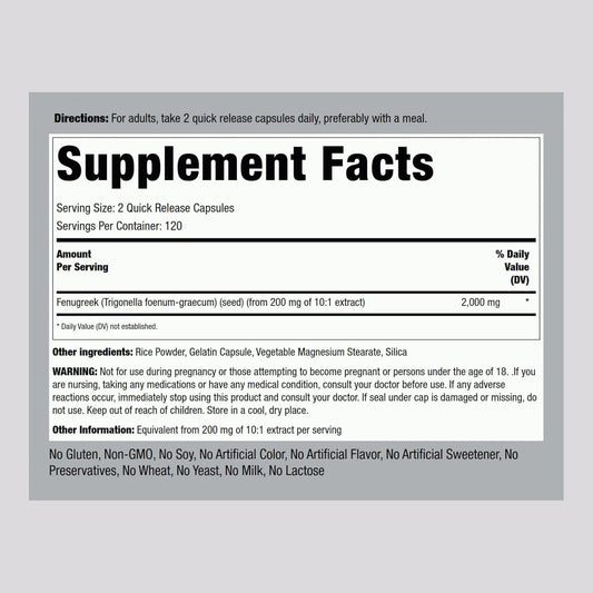 Fenugreek Seed Extract Capsules 2000mg - 240 Count, Non GMO & Gluten Free Herbal Supplement by Piping Rock