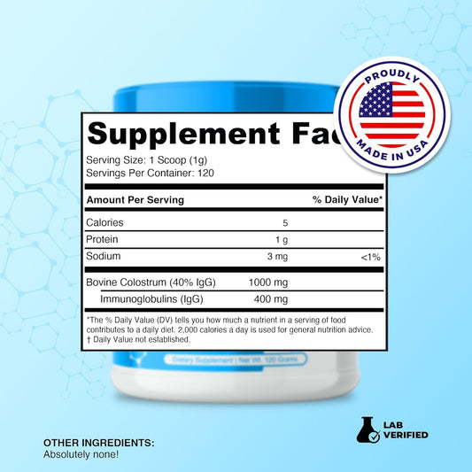 Premium Grass Fed Colostrum Powder with Over 40% IgG for Gut Health, Immunity, Skin & Hair. Supports Muscle Recovery and Ultra Bioavailability. Unflavored, 120 Servings.