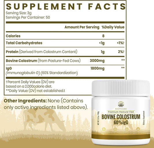 High Potency 3000 mg Bovine Colostrum Powder Supplement - 60% IgG Content - Supports Gut, Bone, Exercise, & Immune Health - 50 Servings - 1 Bottle