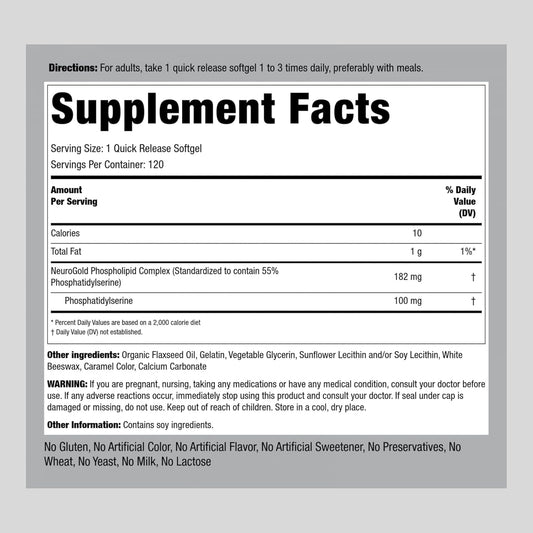 NeuroGold Phosphatidylserine 100mg Softgels - 120 Count - Non-GMO & Gluten Free Brain Health Supplement by Piping Rock