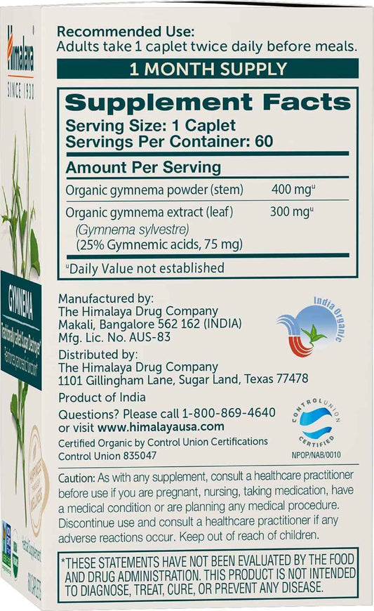 Organic Gymnema Herbal Supplement - USDA Certified, Non-GMO, 700mg, 60 Plant-Based Caplets, 30 Day Supply by Himalaya