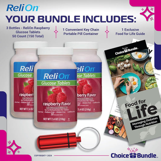 ReliOn Glucose Tablets Raspberry Flavor 150 Count Bundle with Bonus Items