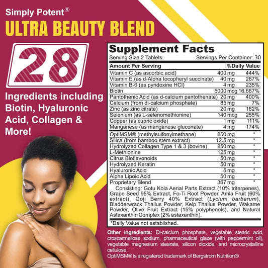 Natural Anti-Aging Hair Skin and Nails Vitamins with 28 Ingredients including Biotin, Keratin, Collagen, and Hyaluronic Acid - 60 Tablets