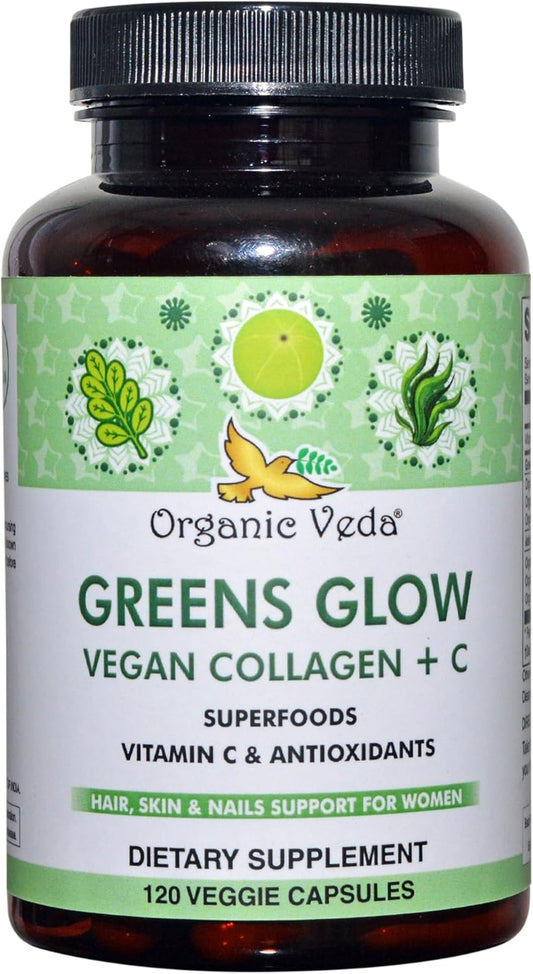 Vegan Collagen Capsules with Biotin for Hair, Skin & Nails - Organic Veda Greens Glow Superfoods Supplement with Vitamin C, E, Hyaluronic Acid, and Moringa - 120 Capsules