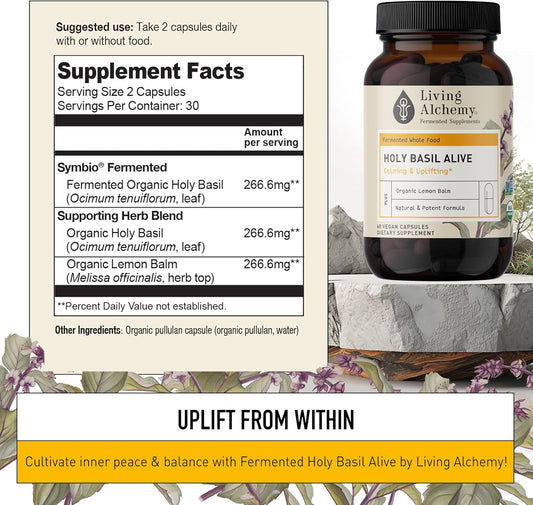 Fermented Holy Basil & Lemon Balm Mood Sleep Aid Supplement for Women & Men - Vegan Non-GMO - Living Alchemy 60 Capsules