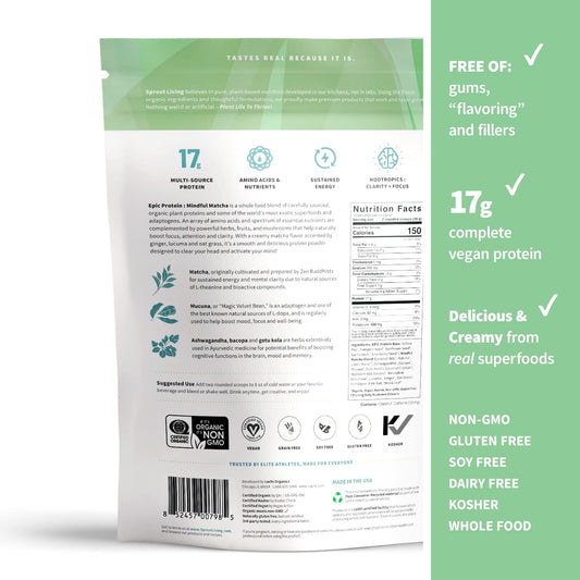 Organic Mindful Matcha Plant Based Protein Powder with Superfoods - 17g Protein, Vegan, Non-GMO, Gluten Free - 1lb, 12 Servings